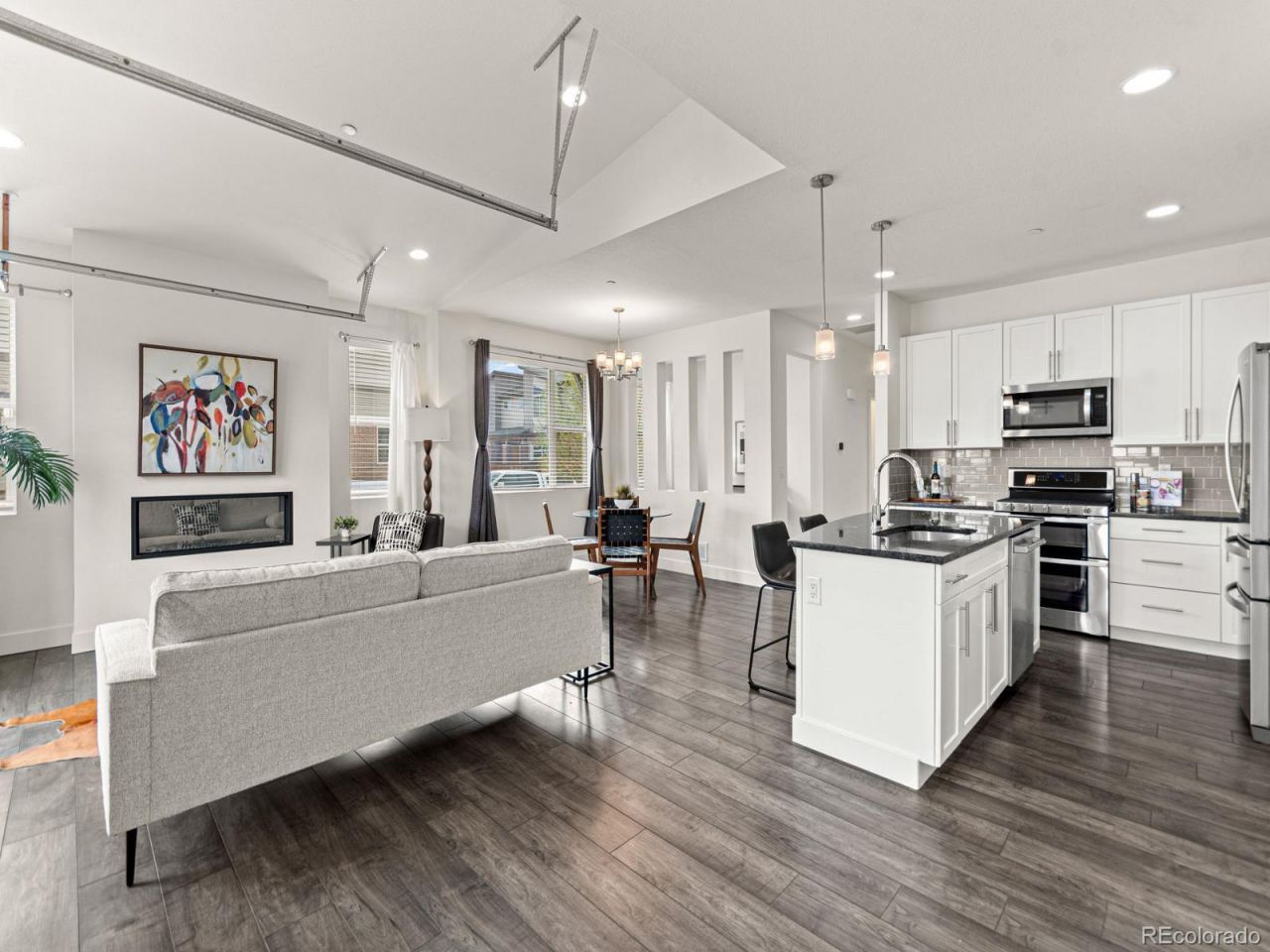 Former model home loaded with upgrades in the sought-after Sunset Terrace at Quincy Overlook community! This stunning ranch-style patio townhome is filled with natural light from the moment the sun rises over the east-facing entry and floods through the master bedroom and living area. The signature feature is the full-view glass roll-up garage door that opens the great room to the enclosed patio, overlooking a peaceful community greenspace ? perfect for morning coffee or watching Colorado snowfall by the fireplace. The kitchen is a showstopper with quartz countertops, soft-close white cabinetry, stainless steel appliances, gas stove, and a large island ideal for entertaining. Premium finishes throughout include recessed lighting, and a multi-mode fireplace. Brand new roof (2024) and new dishwasher (2025). No Metro District! HOA covers exterior maintenance, roof, snow removal, trash, and hazard insurance. Quick access to E-470, walking distance to Two22 Brew, minutes to King Soopers, Quincy Reservoir, and Cherry Creek State Park. Award-winning Cherry Creek Schools ? Summit Elementary, Horizon Middle, Smoky Hill High. Community garden beds and shared greenspace round out this low-maintenance, lock-and-leave lifestyle. This one is special.Listing Broker and Seller make no representation or warranties as to the accuracy of any information provided in the MLS listing including, but not limited to: square footage, bedrooms, bathrooms, lot size, HOA information, parking, taxes or any other data that is provided for informational purposes only. Buyer to verify all information.Seller and one of the listing agents are related.