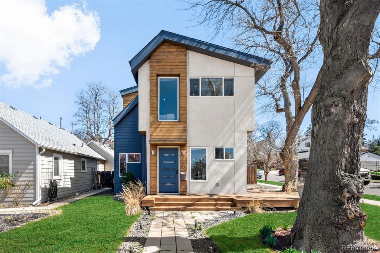 A modern zen-inspired home where smooth concrete finishes and a two-story wall of cascading water create a sense of flow upon entry. A front deck welcomes, wrapping the side of the home. Hardwood floors lead into the main living space, where a gas fireplace-framed in stainless steel -anchors the room. Surrounded by expansive windows, the space feels grounded in natural light. Beyond the main living area, sliding glass doors open to the wraparound deck, reinforcing indoor-outdoor connection. The main living space opens into a dining area with sculptural lighting. An eat-in wet bar elevates the space with open shelving and windows flooding the nook with natural light. The kitchen continues the same design language with a wood eat-in counter, sleek glossy cabinetry, concrete countertops, bold blue tile backsplash, + stainless steel appliances. At the center of the home, a striking interior water feature runs alongside the staircase, framed by a full-height window wall that draws in light. A powder bath and laundry complete the main level. Outdoors is a layered experience, featuring a covered patio extending to multiple elevated decks, a fully fenced backyard + raised garden beds. A paved walkway leads to a secondary entertaining space and detached two-car garage. Upstairs, two secondary bedrooms share a well-appointed full bath, while the primary suite offers a more expansive retreat. The walk-in closet is customized with built-in storage, while the en-suite bath features dual vanities, a full-body integrated mirror, and a spacious walk-in shower with waterfall-style fixtures. A detached residence defined by natural materials + flow, ideally positioned on a corner lot near the highly sought-after South Broadway corridor. Blocks from Harvard Gulch Park/ Golf Course, moments to neighborhood favorite Osteria Alberico, and 3 minutes to the Gothic Theatre, this location offers effortless access to parks, dining, and entertainment.
