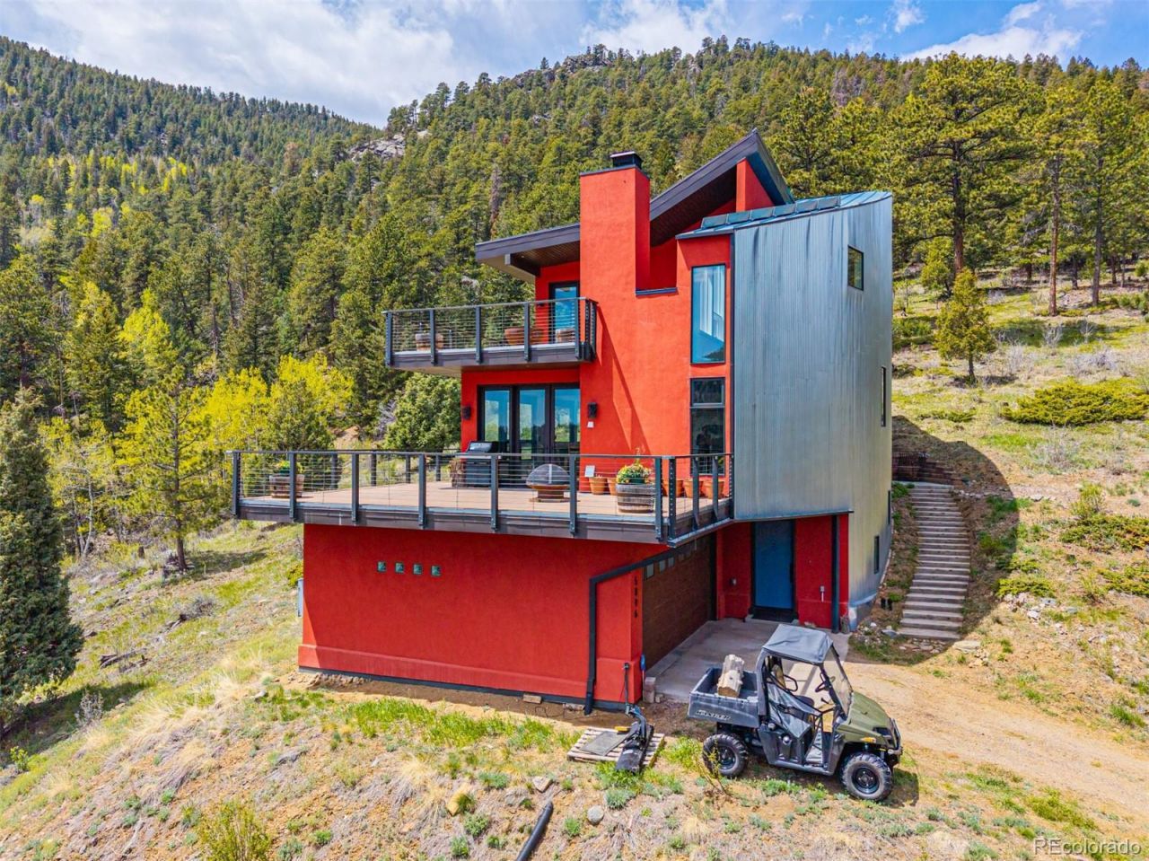 Now offering this beautiful, modern mountain home on 39 acres of pure privacy, with hundreds of acres of Jefferson County Open Space bordering two sides. From the home, youll see only forest, sky, and peaceful seclusion. The land has been thoughtfully maintained to preserve the native ecosystem, where wildlife and natural beauty are part of everyday life.Designed by Gettliffe Architecture in Boulder, this residence blends modern green design with mountain serenity. Fire conscious construction includes stucco siding, a steel north-facing wall, enclosed soffits, concrete deck pavers, and a standing seam metal roof angled for future solar and PV. Passive solar design, thick insulated walls, an Insulated Concrete Form foundation, and radiant concrete floors provide year-round comfort and efficiency. Recycled quartz and glass counters add an eco-friendly touch.Two expansive decks overlook evergreen forest, aspen, a meadow, rock outcroppings, and mountain views, creating a quiet and restorative setting. The layout offers two bedrooms plus an open media room that can be converted to a third bedroom. Enjoy a loft ideal for an office or creative studio, a heated garage, and space for a home gym. Elevator-ready, with space built in for future installation if desired.Just 20 minutes from Golden and close to excellent multi-use trails, fishing, cross-country skiing and more, with easy access to Golden Gate Canyon State Park, Centennial Cone Park, White Ranch Park, and I-70 for Denver dining, culture, and world-class ski resorts.The adjacent 35-acre vacant parcel is also available, which ensures a private driveway. Together, both parcels total 74+ acres and are offered as a separate combined listing for $1,995,000. MLS ID 6540596. Preserve the land as pristine forest, build an additional home, or hold the second parcel as an investment. A rare chance to secure full control of your surroundings and long-term privacy.