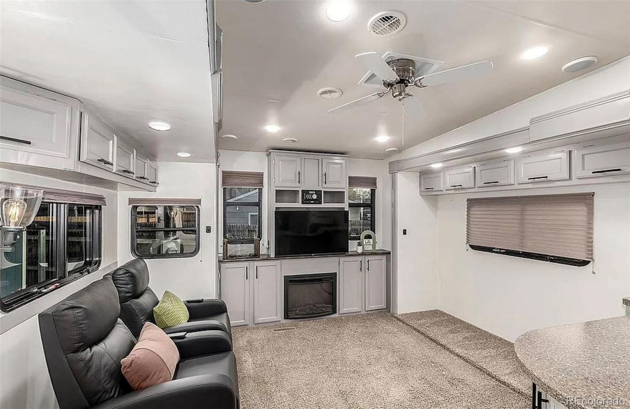This well-maintained 1 bed, 1 bath RV offers comfortable living in a peaceful setting. The open kitchen features a large refrigerator, microwave, island with double sink, and ample cabinet space. The bright living area includes plenty of natural light, overhead and accent lighting, a ceiling fan, and an entertainment center with fireplace and flat-screen TV. Two massage reclining chairs are also included.The bathroom offers a spacious walk-in shower with built-in bench seating. The cozy bedroom features a queen bed, large closet, and hookups for an RV washer and dryer. Outside, enjoy a beautifully landscaped lot with mature trees and stunning views of Pikes Peak. Located in Springs Estates Mobile Home Park with easy access to I-25, shopping, dining, and parks. Lot rent is $925/month. Call today to schedule your showing-this one is a must-see!