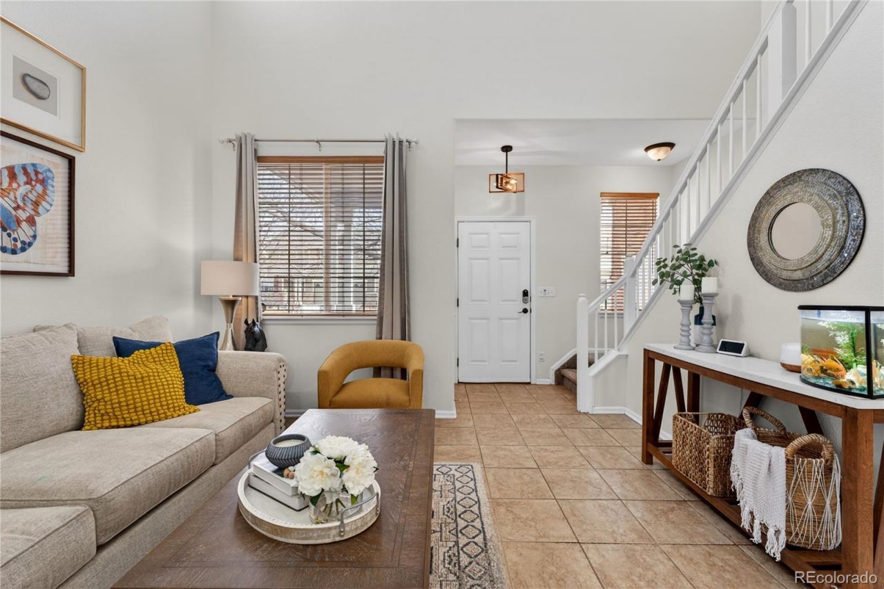 Experience the perfect blend of style and functionality in this beautiful home nestled in the desirable Creekview At River Run community. From the moment you arrive, you are greeted by lovely curb appeal and a charming covered front porch that invites you inside. The entrance opens into a grand living room featuring soaring high ceilings and a sophisticated dual-sided gas fireplace that serves as a stunning focal point. The layout flows naturally into the heart of the home, where the family room, dining area, and kitchen converge. Here, you can enjoy the second side of the fireplace in the cozy family room, or step through sliding doors off the dining area to the backyard for seamless indoor-outdoor living. The kitchen is a chefs delight, equipped with granite tile countertops, stainless steel appliances, and a convenient pantry. The main level is rounded out by a practical laundry room with direct access to the attached two-car garage and a well-placed powder room for guests. Retreat upstairs to find a private primary bedroom suite, a true sanctuary boasting a full en-suite bath and a spacious walk-in closet. Three additional bright and airy bedrooms share a second full bathroom, providing ample space for all. Step outside to discover an entertainers dream in the fully fenced backyard. A large covered patio offers a shaded retreat for summer BBQs, leading out to a high-quality turf yard designed for effortless, year-round maintenance. Located in the award-winning Cherry Creek School District and zoned for Grandview High School, this home is perfectly situated between Parker and Centennial. Youll enjoy easy access to top-tier shopping, dining, and recreation in a central location that truly has it all!