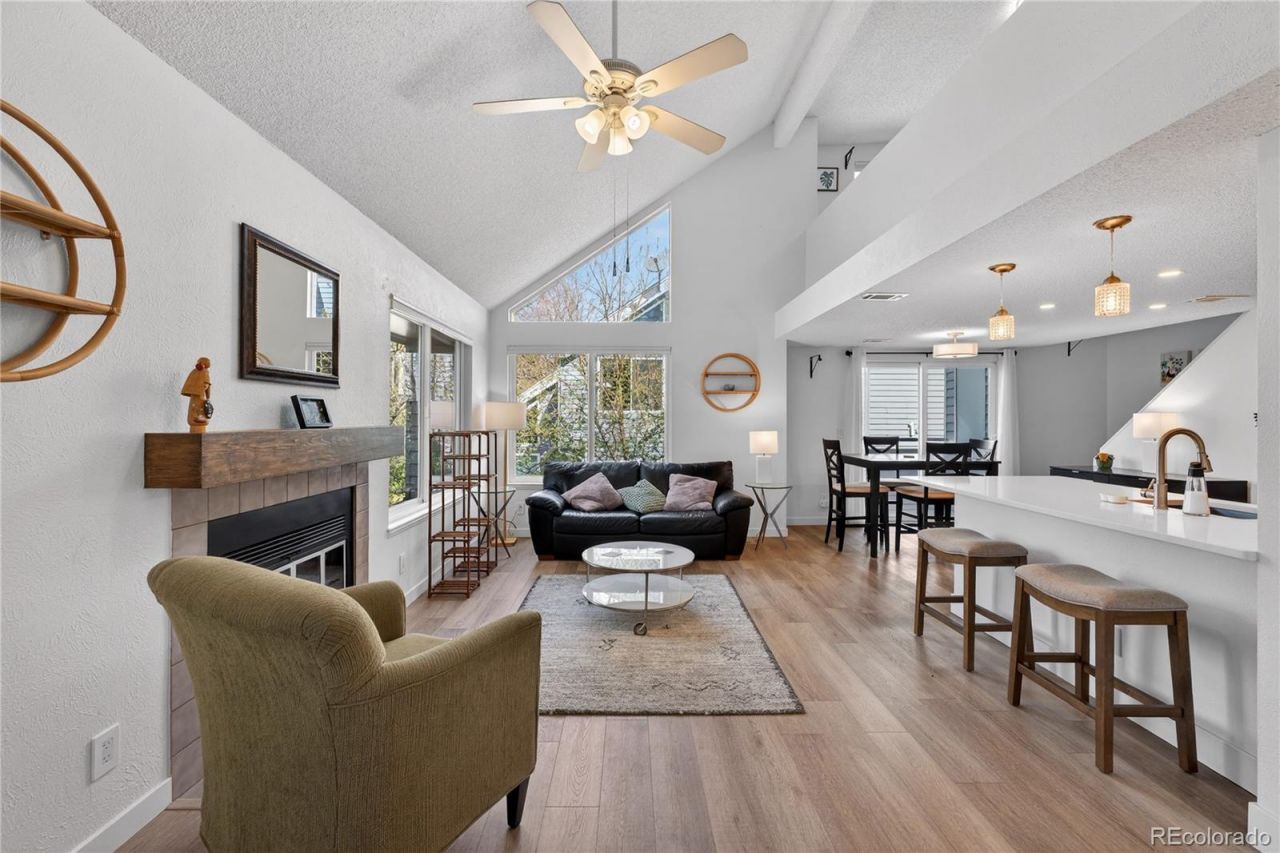 Tucked into a quiet, tree-lined community, this beautifully updated condo feels like a hidden retreat with light pouring in from every angle. Vaulted ceilings elevate the main living space, where expansive windows frame peaceful views of mature trees and fill the home with a warm, airy glow. The open layout flows effortlessly from the living room, anchored by a cozy fireplace, into a spacious dining area and out to a private balcony with extra storage space, perfect for morning coffee or winding down in the evenings. Luxury vinyl plank flooring runs throughout the main level, adding both style and durability, while the updated kitchen shines with quartz countertops, sleek cabinetry, stainless steel and black appliances, and a deep sink with a modern faucet that makes everyday living feel a little more elevated. The bedroom offers a comfortable escape with double doors and a walk-in closet, paired with a refreshed bathroom featuring a clean, updated vanity. Upstairs, a versatile loft adds extra flexibility for a second non-conforming bedroom. Added conveniences include in-unit washer and dryer and a reserved parking space within the community. Enjoy a serene setting with community water features, mature landscaping, peaceful walking paths, and access to a community pool for warm summer days, all just minutes from I-225, I-25, light rail, DTC, DIA, and downtown, delivering the perfect blend of calm, convenience, and low-maintenance living.