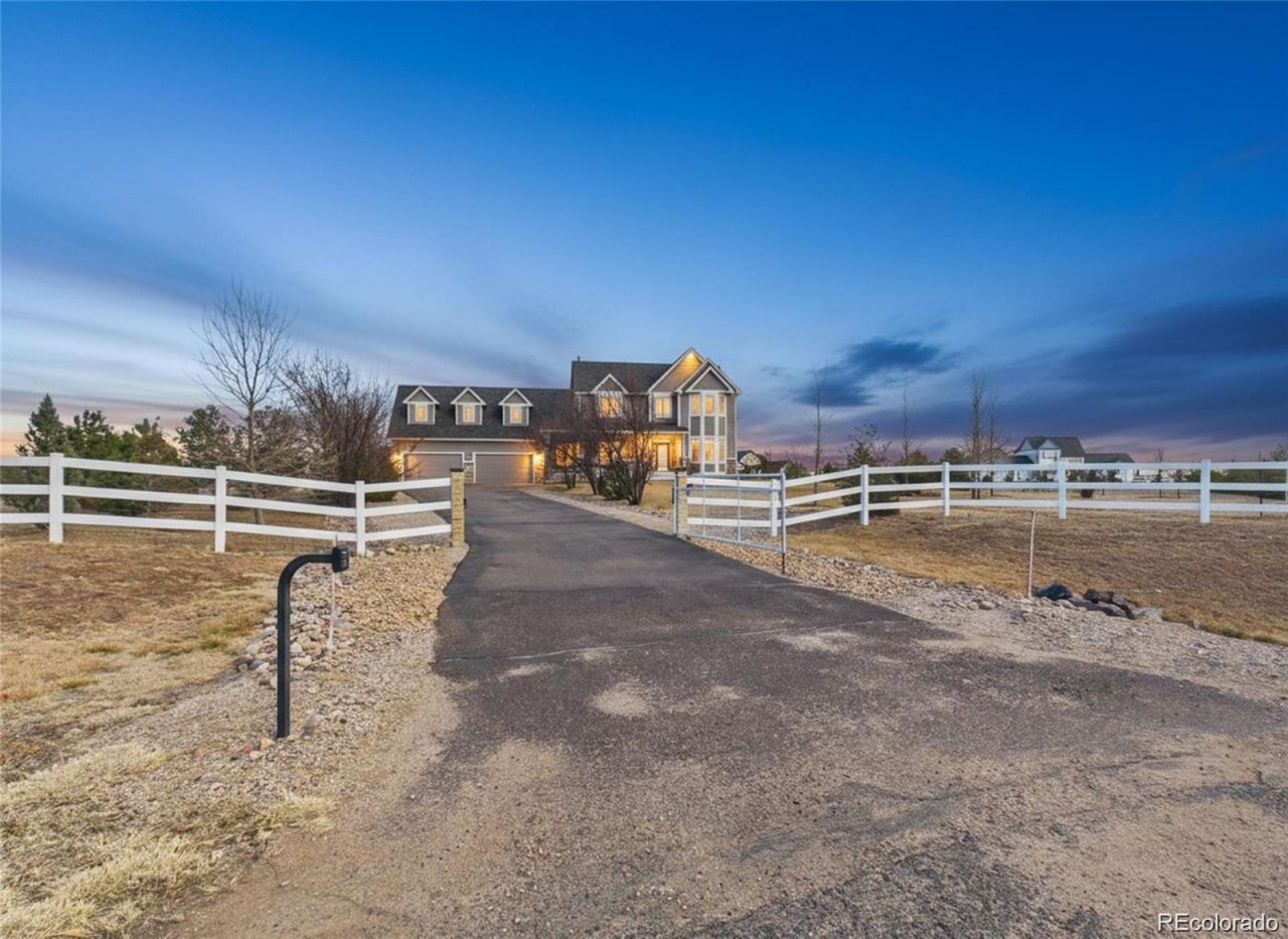 Mountain Views and country living just minutes to the city! This exceptional property is conveniently located near I-70 and E-470, providing easy access to DIA, shopping, hospitals, and more, while still offering the peace and privacy of wide-open space. Situated on two and a half acres, this beautiful home delivers true country charm with a wrap-around front porch, fully fenced lot and a massive 4-car garage, perfect for vehicles, storage, or hobbies. Start your mornings with breathtaking sunrises and unwind in the evenings with stunning sunsets over the Rocky Mountains. The spacious yard and large covered back patio create the perfect setting for entertaining guests or simply relaxing outdoors. Step inside to gleaming hardwood floors and plantation shutters that set a warm and welcoming tone throughout the home. The large gourmet kitchen is a true gathering place, featuring double ovens, a gas cooktop, generous counter space, and abundant storage. Thoughtfully designed, the home also includes a dedicated office, formal dining room, and an expansive primary suite. A separate versatile bonus room with a bedroom and a full bath is perfect for family gatherings or as a mother-in-law suite. Additional features include a large storage shed, irrigated yard or add an outbuilding giving you even more space for storage. Located in a friendly community with parks, local restaurants, and recreational sports nearby, this home truly has it all, a rare blend of comfort, convenience, and Colorado charm. Just 15 minutes to DIA and 20 minutes to Southlands mall this home is a must see. This is a wonderful place to call home!